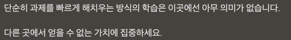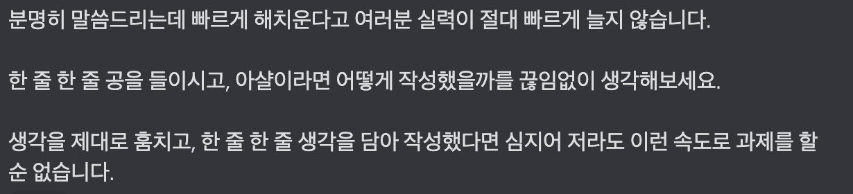 이렇게 계속 과제 해결 속도가 늦어져 걱정하고 있었는데 홀맨님이 3기 디스코드에 남겨주신 말씀을 보고 다시 한번 생각해 보게 됐다.