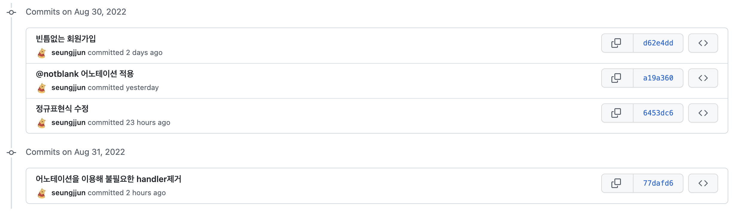 오늘 빈틈없는 회원가입 퀘스트를 리팩터링 하기 위해서 기존에 내가 작성한 회원가입 시 예외처리 부분만 다 지우고 예외처리를 새로 작성하고 싶었는데 고쳐할게 많아서 불필요한 코드를 지우다 지우면 안 될 것까지 같이 지우면서 불필요한 에러를 해결하다 시간을 소비했다.