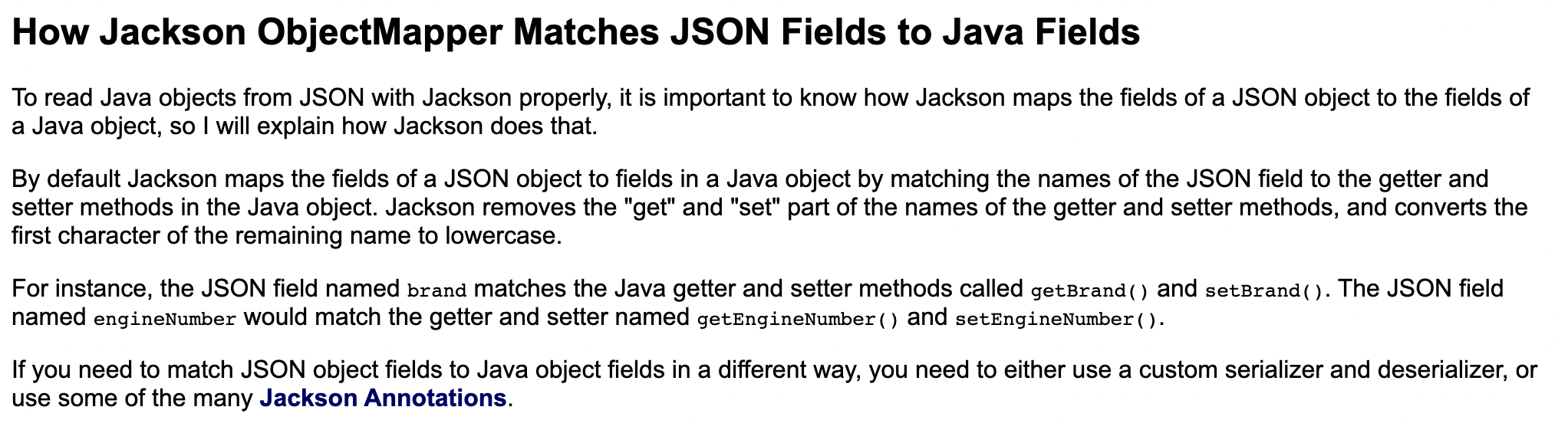JSON의 이름과 객체의 getter, setter 메서드의 필드명을 비교하여 매칭을 한다고 한다. 그리고 getter, setter 메서드 이름의 "get"및 "set"부분을 제거하고 나머지 이름의 첫 문자를 소문자로 변환한다고 한다.