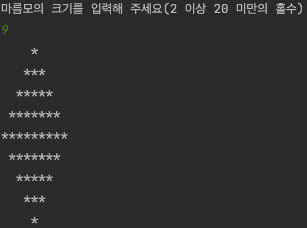 입력받은 수 만큼 별문자("*")를 이용해서 삼각형과 마름모를 출력하는 문제가 주간과제에 있었다.