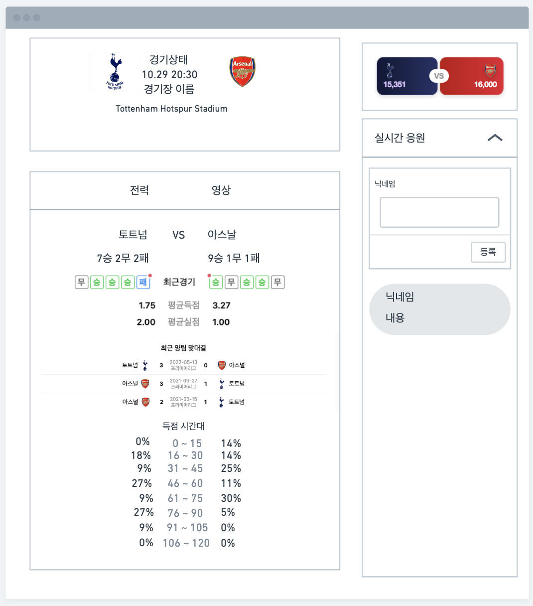 아래와 같은 페이지 처럼 구현이 될것 같은데 그러기 위해서는 채팅 기능 뿐만 아니라 해당 경기에 대한 데이터가 필요했었다.