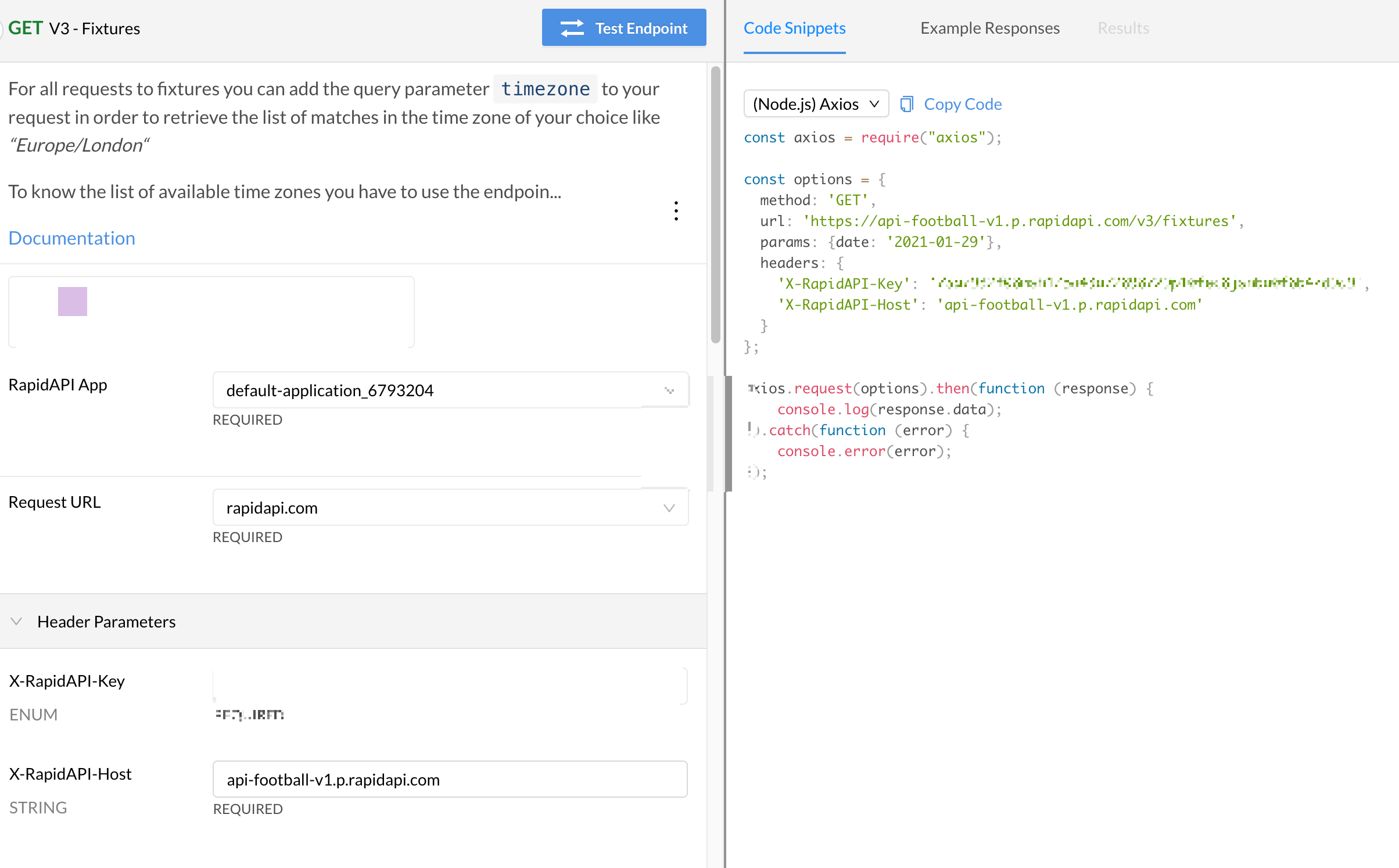 자기가 사용하는 언어를 고르면 자동으로 api주소와 api-key가 코드로 작성되어 편리하게 복사해서 사용할 수도 있다.
