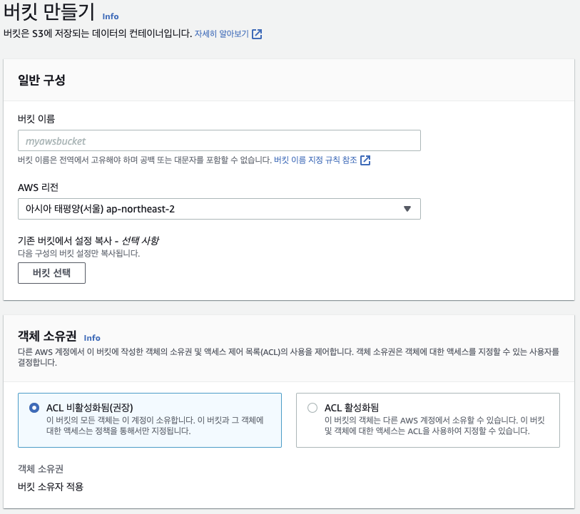 첫 번째 새 ACL(액세스 제어 목록)을 통해 부여된 버킷 및 객체에 대한 퍼블릭 액세스 차단을 해제하면 객체를(이미지 파일) 업로드할 수 있다.