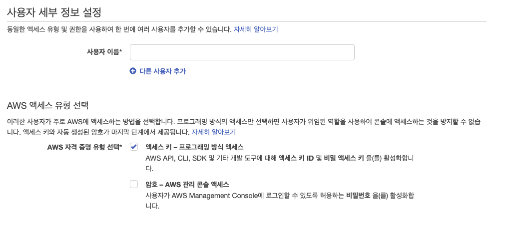IAM 서비스 -> 사용자 -> 사용자 추가로 이동후 사용자 이름을 입력하고 엑세스키 - 프로그래밍 방식 엑세스을 체크해준다.
