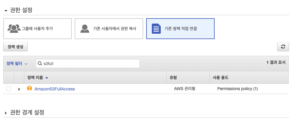 기존 정책 직접 연결을 클릭하고, S3를 검색하여 AmazonS3FullAccess을 선택한다. 다음 태그는 선택사항이라 입력해도 좋고 입력하지 않아도 괜찮다.