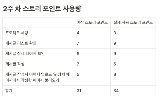 3포인트 정도 오차가 났는데 차이가 난 이유가 가장 처음에 구현한 기능이 게시글 리스트 확인인데 생각하지 못했던 부분(인수 테스트 작성이나 스토어 생성이나 )에서 시간을 많이 사용했었다. 그 부분들이 인수 테스트 작성이나 스토어 생성, 테스트 서버 작성 등등 처음에 해줘야 하는 작업들을 생각하지 못하고 스토리 포인트를 매겨 오차가 난 것 같다.