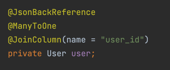 @JsonBackReference -> 참조의 역방향 부분을 관리하고 이 어노테이션을 추가한 필드는 직렬화되지 않는다