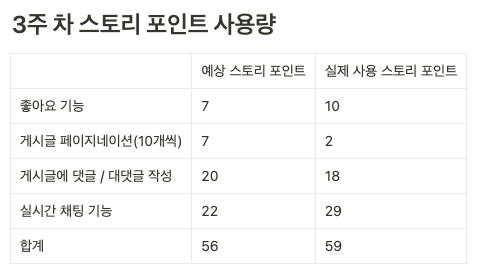 이번 주는 객체 구조를 바꾸는 데 시간을 너무 많이 사용했다. 실제로 주중에 2번을 바꾸면서 좋아요 기능과 댓글 기능을 구현하는데 예상했던 스토리 포인트를 객체 구조를 바꾸는 데 사용을 해서 예상했던 것보다 오버되기도 했다.
