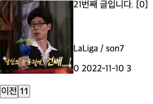 다음 페이지를 눌러서 11페이지에 가보면 마지막 게시글이기 때문에 12페이지 버튼과 다음 페이지 버튼이 존재하지 않고 이전 페이지로 갈 수 있는 버튼이 생긴 것을 확인할 수 있다.