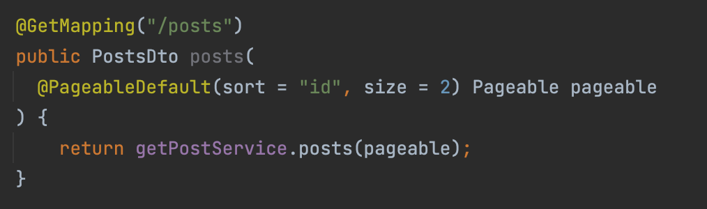 pagination을 할 Controller에서 위와 같은 방식으로 Pageable 설정하면 /posts로 요청할 때 page를 같이 넘겨주면 pageable객체를 자동으로 만들어진다.