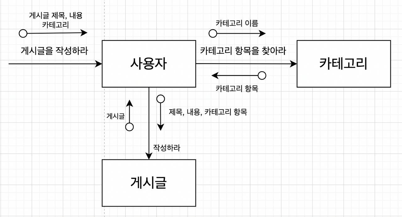 사용자는 게시판에게 자신이 작성하고 싶은 게시물의 정보를 작성을 요청한다. 객체지향 관점에서 보면 사용자 역시 하나의 객체이다.