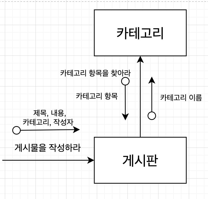 먼저 "게시물을 작성하라" 메시지를 처리할 적합한 객체로 사용자가 아닌 게시판을 선택했다. 이제 게시판 객체는 게시물을 작성할 책임을 위임받게 되었다. 게시판 객체는 카테고리 항목을 알지 못하기 때문에 카테고리 항목을 누군가가 제공해주어야 한다. 항목을 전달해준 가장 적합한 객체가 카테고리 항목 객체들을 갖고 있는 카테고리 객체이다. 따라서 "카테고리 항목을 찾아라" 메시지를 수신한 카테고리는 카테고리 이름에 대응되는 카테고리 항목을 게시판에게 반환해야 한다.