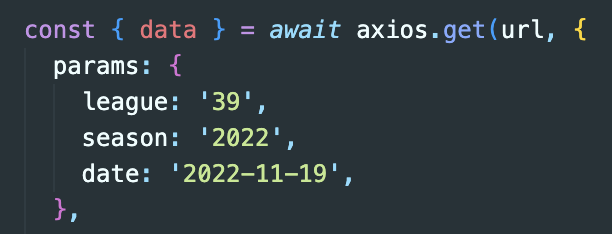 캘린더를 이용해 사용자가 선택한 날짜의 리그 일정만 받아오면 불필요하게 매번 300개가 넘는 데이터를 받아올 필요가 없을 것 같다는 생각을 했다. 그러기 위해서는 해당 날짜의 경기 데이터만 받아오는 방법을 알아야 했는데 rapid api 사이트에 들어가서 방법을 찾아보다 params에 원하는 날짜를 전달해주면 해당 날짜의 경기 일정만 받아올 수 있는 것을 알게 되었다.