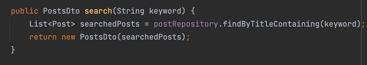 서비스에서는 해당 키워드가 포함된 게시물들을 findByTitleContaining 메서드를 이용해 postRepository에서 찾는다.