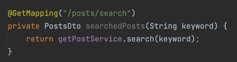 프론트엔드에서 찾고 싶은 게시물의 제목을 검색해서 params로 넘겨주면 controller에서 검색 키워드를 받아 서비스로 넘겨준다.