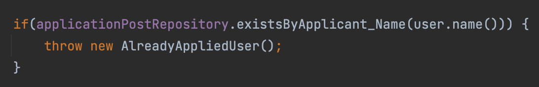 이때 중복 신청을 방지하기 위해 이미 신청 중에 있는 사용자는 신청 못하게 해야 했다. 그래서 신청한 유저 닉네임으로 신청 게시글 레파지토리에서 신청한 게시글이 존재하는지 (existsByApplicant_Name) 확인 후 있으면 예외처리를 해주었다.