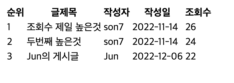코드를 수정하고 다시 실행해보면 아래와 같이 조회수 순대로 3개의 게시글만 가져오는 것을 확인할 수 있다.