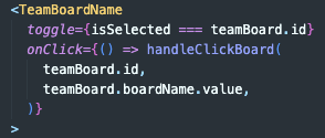 useState에 저장되어있는 메뉴 아이디 값과 현재 map으로 뿌려주고 있는 메뉴의 아이디(teamBoard.id) 값이 같으면 color를 변경하는 것이다.