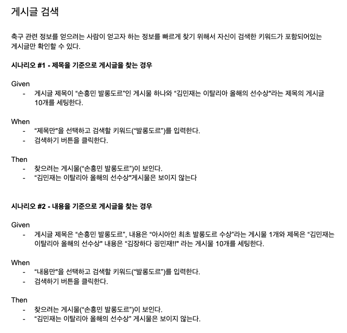 개발 단계에서 단위 테스트를 통해 각 기능들을 검증하지만 단위 테스트만으로는 시스템이 웹 브라우저에서 제대로 작동하는지 알 수가 없다. 그래서 사용자 스토리를 바탕으로 시나리오를 만들어서 개발 단계에서 기능이 하나 완성되면 인수 테스트를 통해 잘 작동하는지 검증하기 위해 인수 테스트 시나리오를 작성하였다.