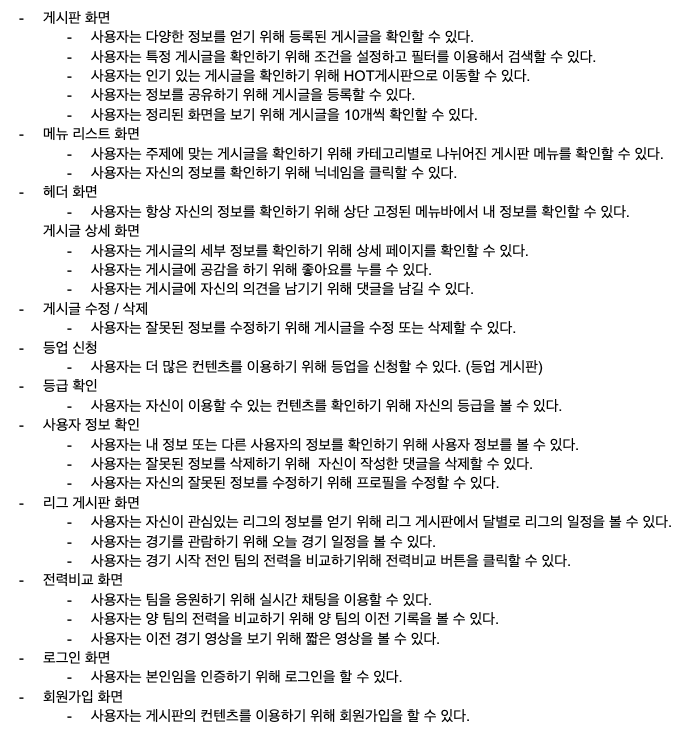기획 단계에서 가장 처음에 한 일은 UI를 구상해보고 구현할 기능들을 리스트업 하는 것이었다. 어떤 화면을 어떻게 구상할 것인지 어떤 기능들을 구현할 것인지 그리고 나열해 봤다. 화면은 개발자가 아닌 일반인들도 이해가 갈 수 있도록 화면에 대한 설명도 적으면서 기획했다.