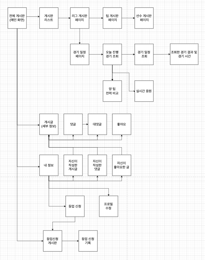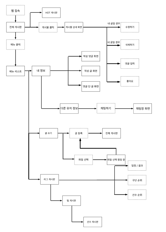 이후에 웹 프로세스 구조도를 그려보았다. 구조도는 위에서 작성한 UI와 리스트업 한 기능들을 바탕으로 UI를 어떻게 연결시킬지, 즉 어떤 버튼을 클릭했을 때 어떤 화면으로 이동하는지에 대한 플로우를 그려보는 작업이다.