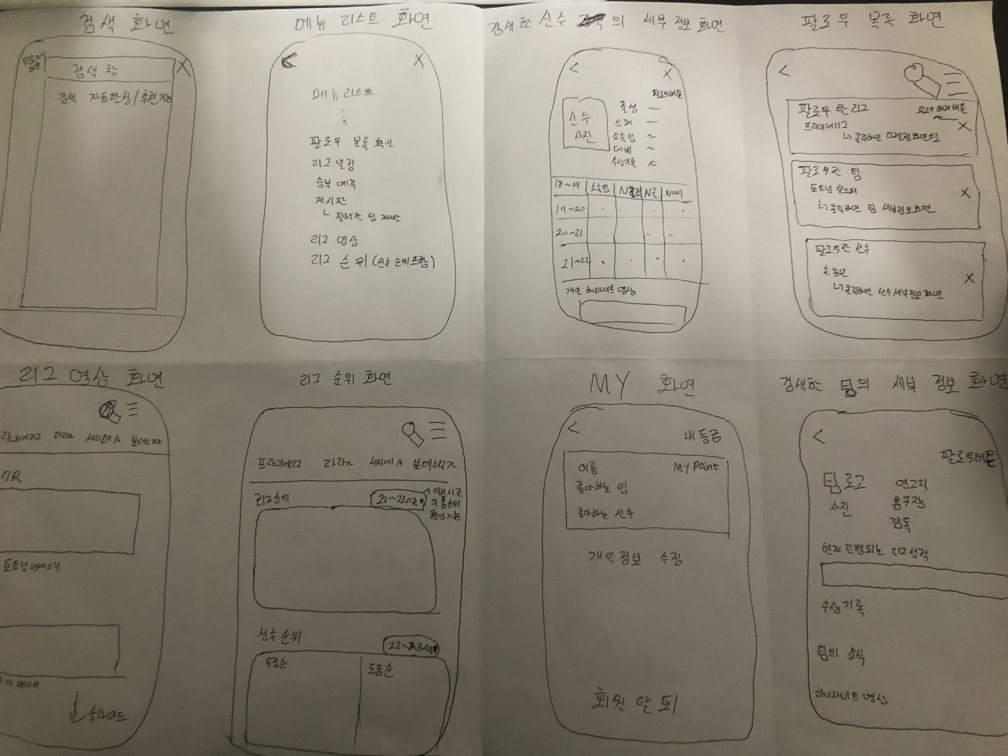 처음에는 내가 평소에 축구 하이라이트 영상이나 경기 일정 및 순위 같은 것을 많이 찾아보는 편인데 이게 한 사이트에 정리되어 있는 곳이 없어 유튜브 가서 하이라이트 영상 보고 네이버에서 경기 일정이랑 순위 찾아보고 또 경기에 대한 정보는 다른 커뮤니티 사이트들을 보면서 찾아보는 번거로움이 있었다. 그래서 나는 이 정보들을 한곳에서 볼 수 있도록 기획 방향을 잡고 설레는 마음으로 종이에 직접 손으로 구상할 화면들을 그려보았다. (이때는 몰랐다. 디자인 툴을 사용해서 작업하는 게 더 편하다는 것을....)