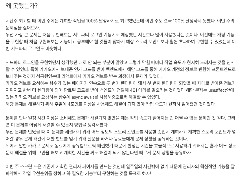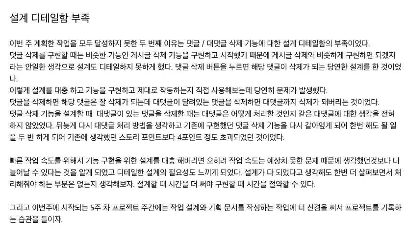 그리고 스프린트 회고가 끝나고 나서는 주간회고를 작성하면서 이번 스프린트에서 달성하지 못했던 작업들에 대해 구체적인 회고를 진행했다. 달성하지 못한 이유와 원인을 파악하고 다음 스프린트에는 동일한 문제로 목표 달성에 차질이 없도록 어떻게 하는 것이 좋을지 고민도 해보았다.