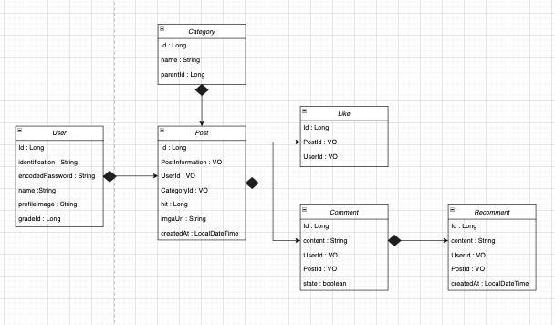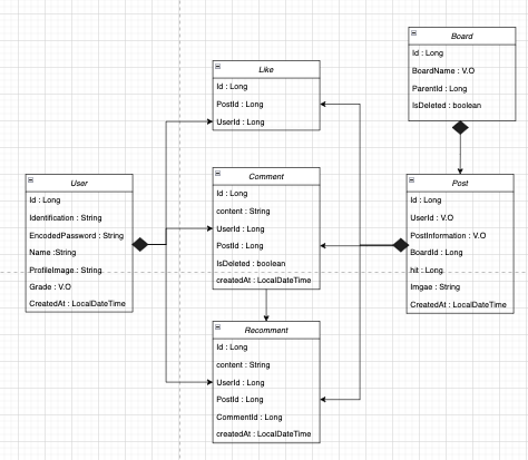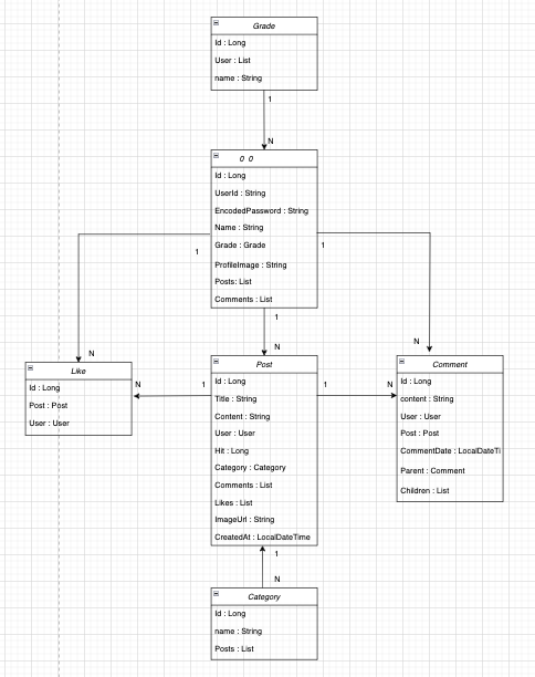 객체 설계는 아래와 같이 draw.io를 이용해 Entity의 관계를 그리면서 설계를 했었다.