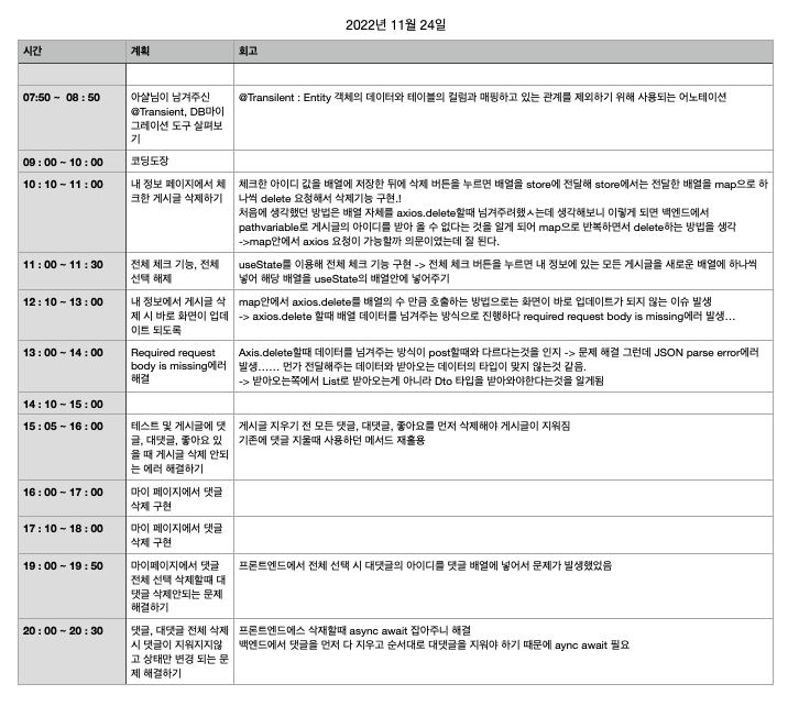 그리고 작업 설계도 미리 잘 설계된 문서를 바탕으로 고민 없이 코드만 칠 수 있도록 구체적으로 설계했어야 했는데 그러지 못했다. 코드를 치면서 개발하는 도중에 생각하는 시간이 길었다. 이로 인해 잘못된 코드를 작성해서 리팩터링 하는데 시간을 많이 쓴 적이 있다.