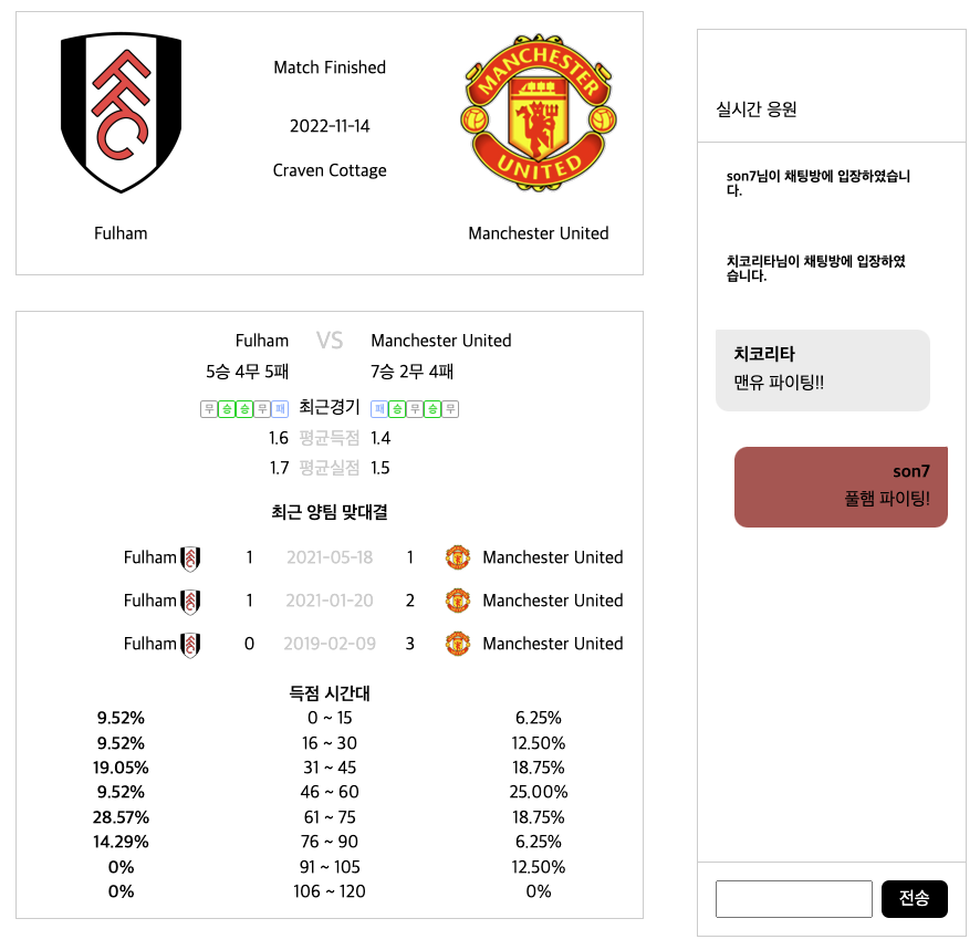 - 경기 일정화면에서 오늘 날짜 기준으로 진행될 경기의 "전력 비교" 버튼을 클릭 시 해당 매치 업의 경기 전력을 비교하는 정보와 함께 해당 페이지에 접속한 사용자끼리 실시간 채팅을 통해 응원할 수 있는 기능이다.