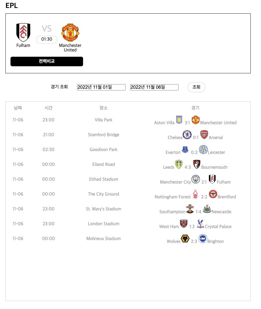 - 오늘 날짜 기준으로 진행되는 경기들을 상단에서 확인할 수 있고 직접 경기 결과나 일정을 확인하고 싶은 날짜를 선택해서 해당 날짜 사이의 경기들의 정보를 확인할 수 있다.