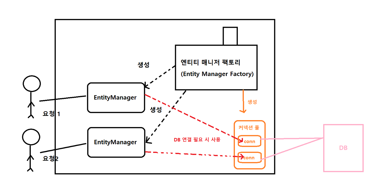 영속성 컨텍스트는 어플리케이션이 데이터베이스에서 가져온 객체를 보관하는 역할을 하는데 엔티티 매니저 (EntityManager)를 통해서 영속성 컨텍스트에 접근한다. 엔티티 매니저는 connection이 필요한 시점에 엔티티 매니저 팩토리가 생성한다.