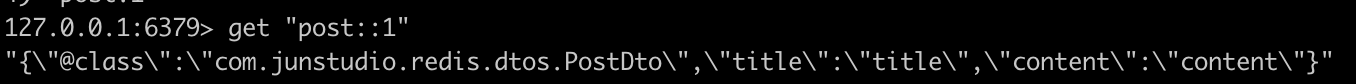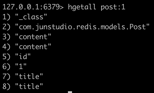 hgetall post:1 명령어를 통해 Post(1L, "title", "content")가 저장되었는지 확인을 해보면 아래와 같이 확인할 수 있다.