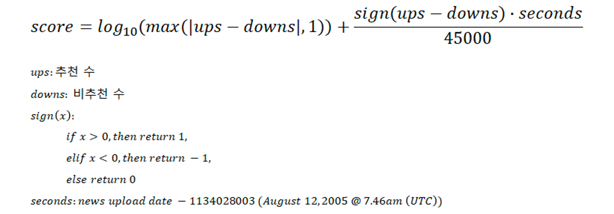 분모의 45000(초)은 12시간 30분과 같다. 즉, 오픈 일자로부터 12시간 30분이 지날 때마다 1점이 추가된다.
