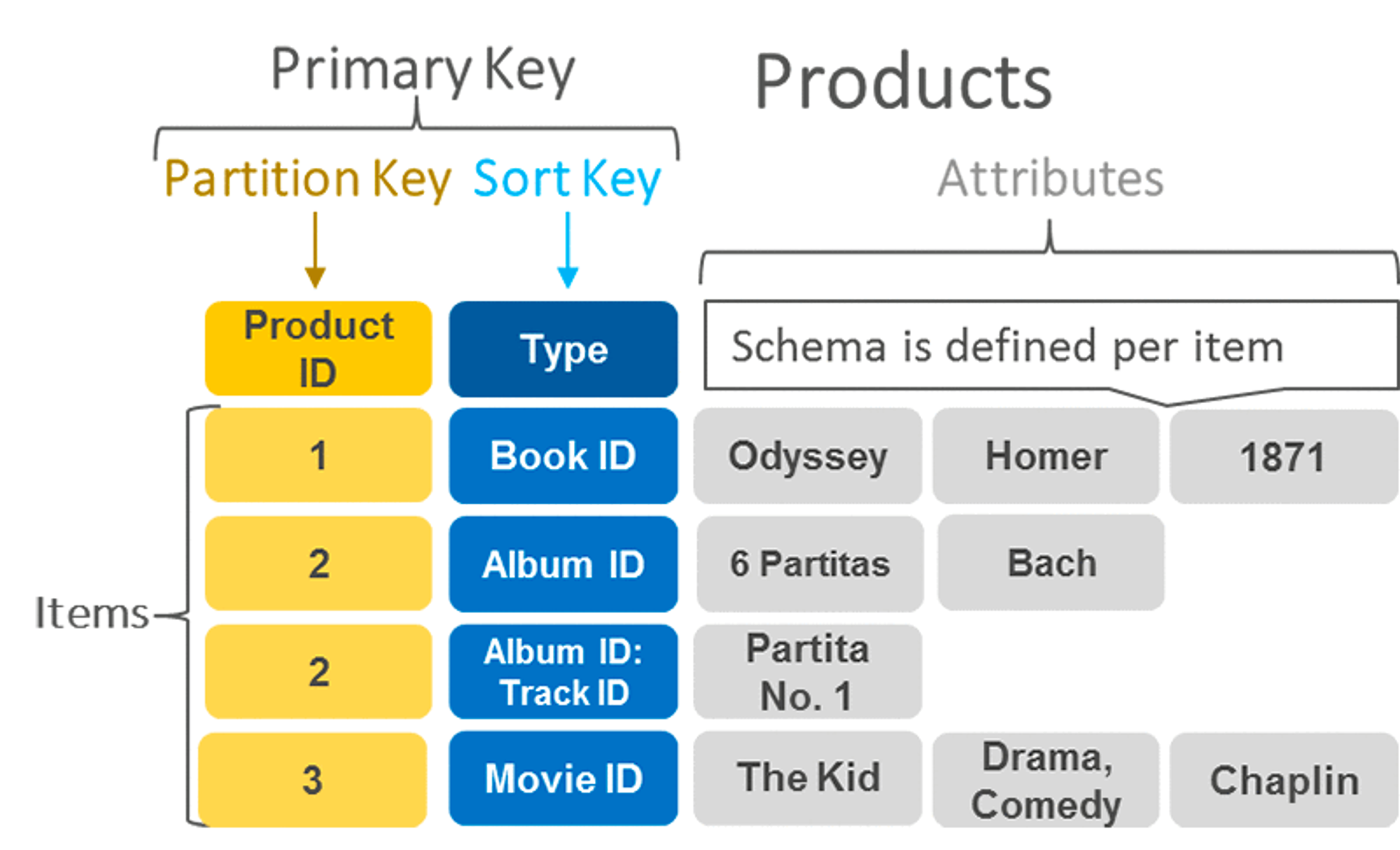위 사진을 보면 Product ID가 partition key이고 type이 sort key로 사용하고 있다.
