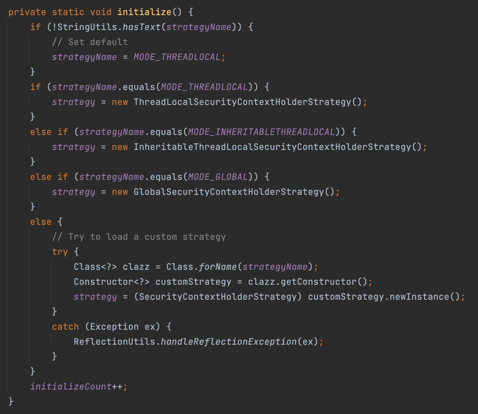 SecurityContextHolder 전략에는 MODE_THREADLOCAL, MODE_INHERITABLETHREADLOCAL, MODE_GLOBAL 총 3가지 전략이 존재한다.
