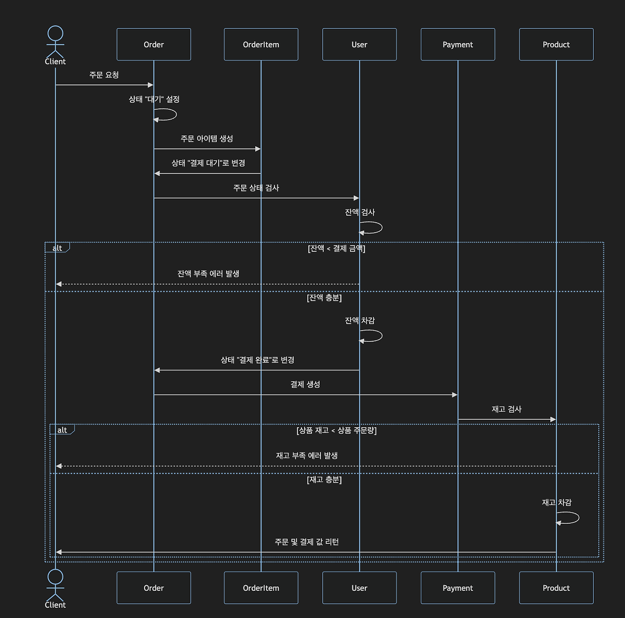 client -> 결제 요청(주문 정보 전달) -> 주문 상태 검사 ("주문 완료"가 아니면 예외 처리) -> 사용자 잔액 검사 (잔액 부족 시 주문 상태 "결제 실패"로 변경 후 주문 상품 재고 롤백(보상 트랜잭션) 하고 결제 실패 (결제 엔티티 생성 x)) -> 잔액 차감 -> 주문 상태 "결제 완료"로 변경 -> 결제 엔티티 생성