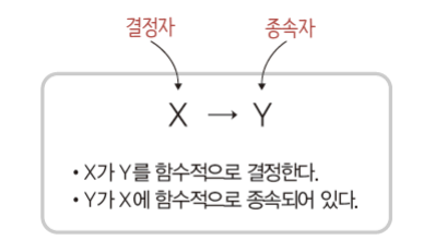 함수적 종속성이란, 테이블 내에서 한 속성 X 값에 따라 다른 속성 Y의 값이 유일하게 결정이 될 때 “X가 Y를 함수적으로 결정한다.”라고 표현한다.