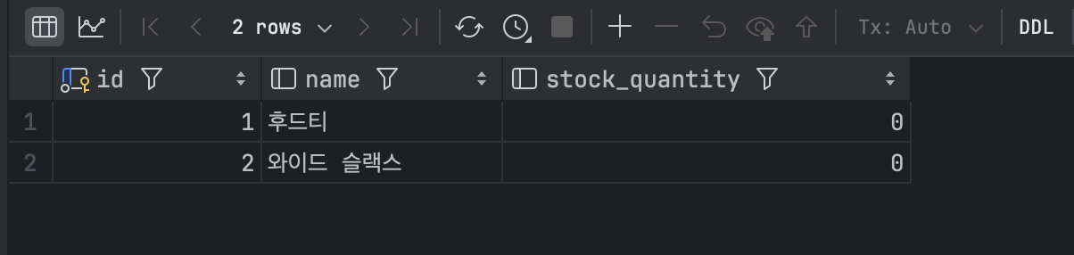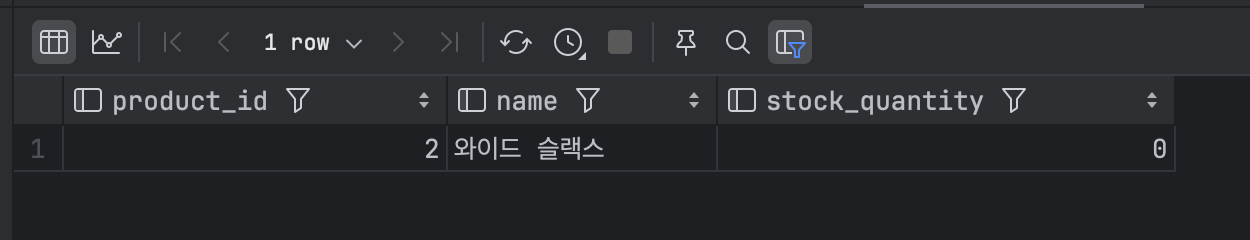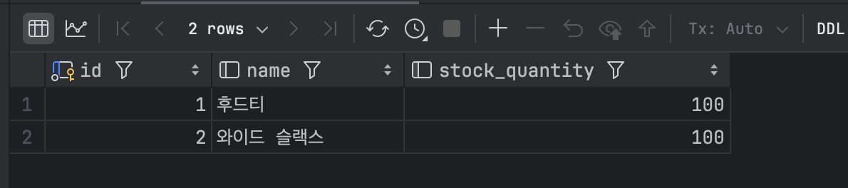 위 테스트를 실행하여 실행 결과와 db 재고 값을 확인해 보겠습니다.