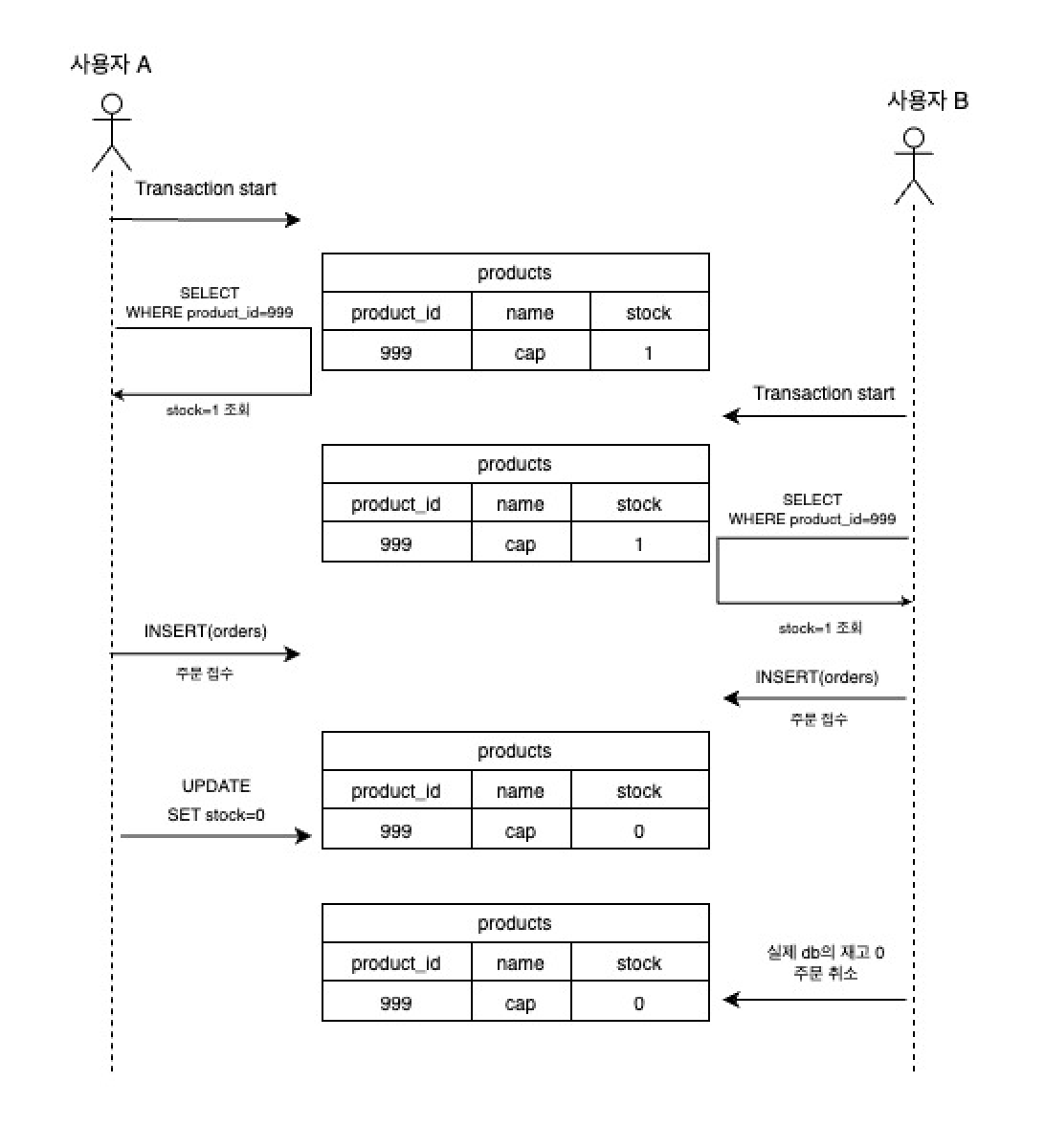 4. 사용자 B의 트랜잭션에서 재고 차감을 하려 하지만 재고가 0이기 때문에 재고 차감 실패 및 주문 취소