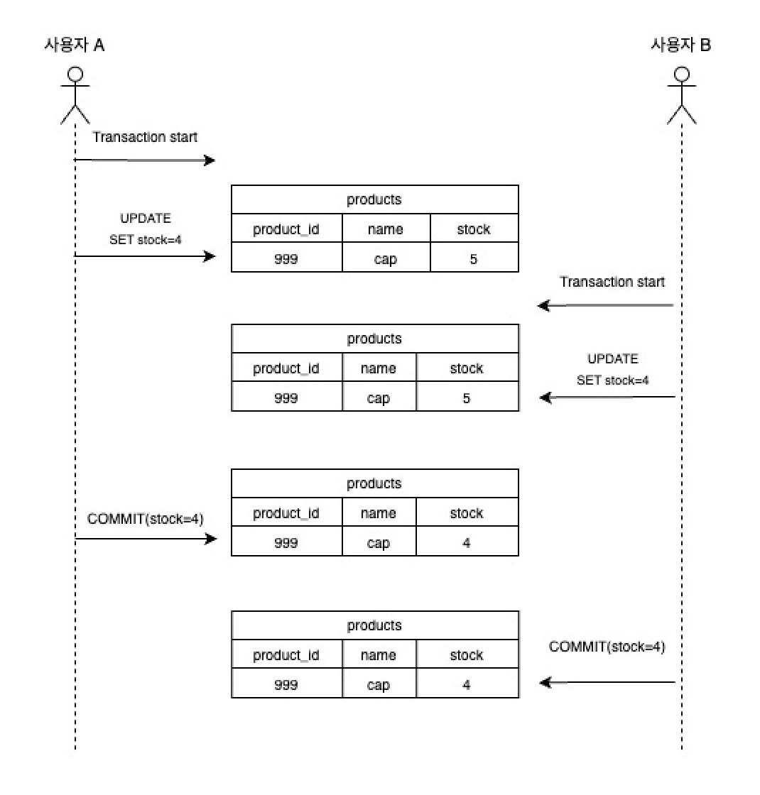 3. 사용자 B의 트랜잭션이 사용자 A의 트랜잭션이 커밋되기 전 상품 재고를 조회(이 시점 재고는 5개)하였기 때문에, 재고를 4개로 차감