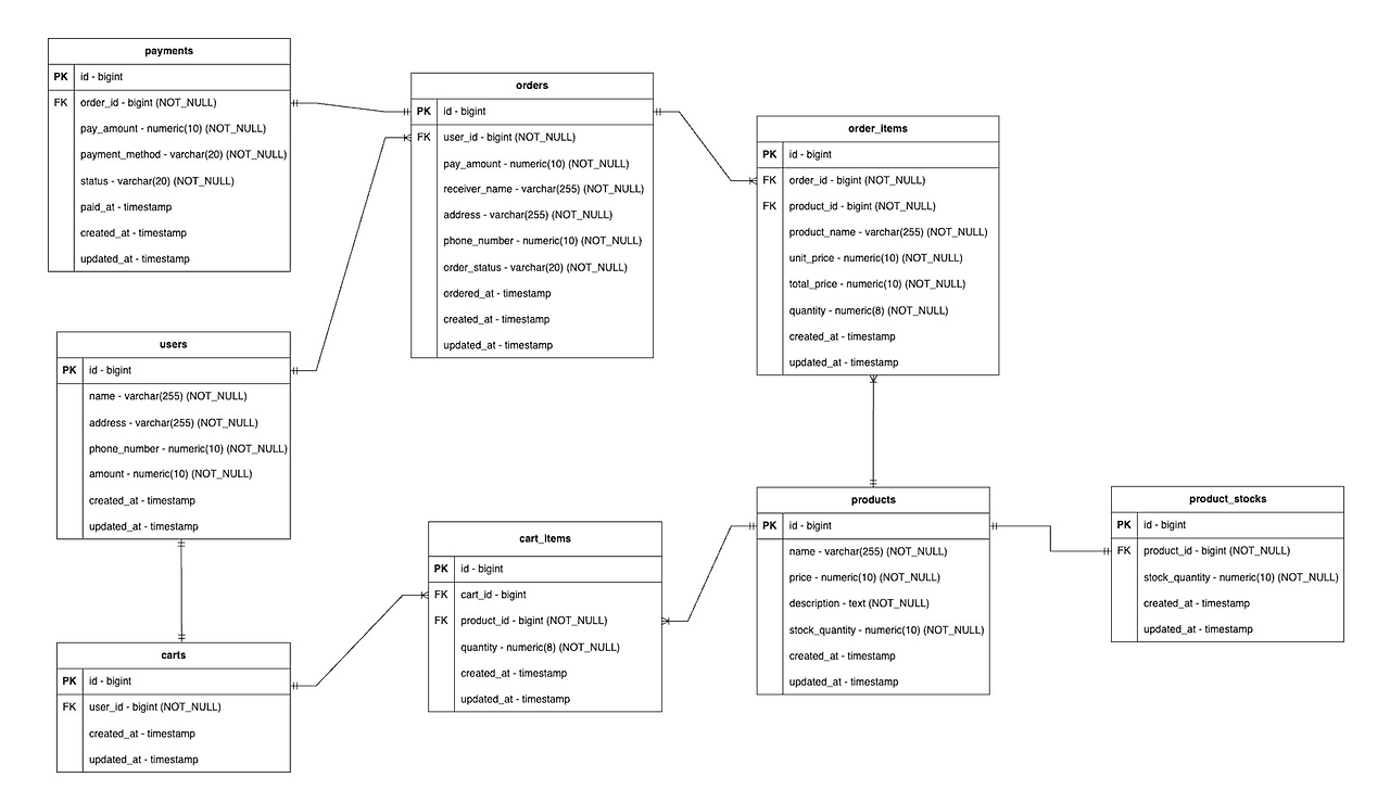 상품(products) 테이블과 상품 재고(product_stocks) 테이블을 분리한 이유는 상품 테이블에 비관적 락을 걸게 될 경우 단순히 상품을 조회하는 요청에서도 락을 기다려야 하는 상황이 발생하기 때문에 상품 주문 시 재고 차감은 product_stocks 테이블에 락을 걸고 상품 조회는 prodcuts 테이블을 바라보고 조회하도록 하기 위함입니다.