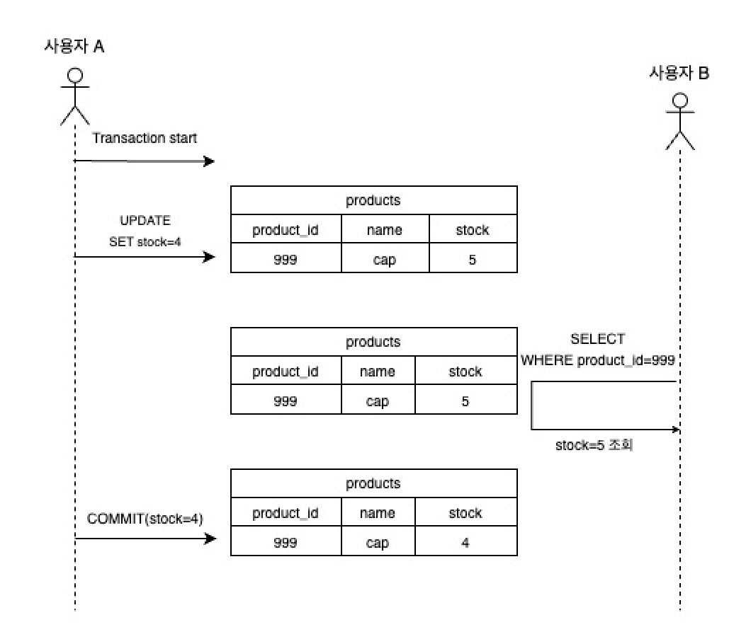 2. 사용자 B는 동시에 동일 상품의 재고를 확인하며, A의 트랜잭션이 아직 커밋되지 않았기 때문에 재고가 3개인 것으로 확인