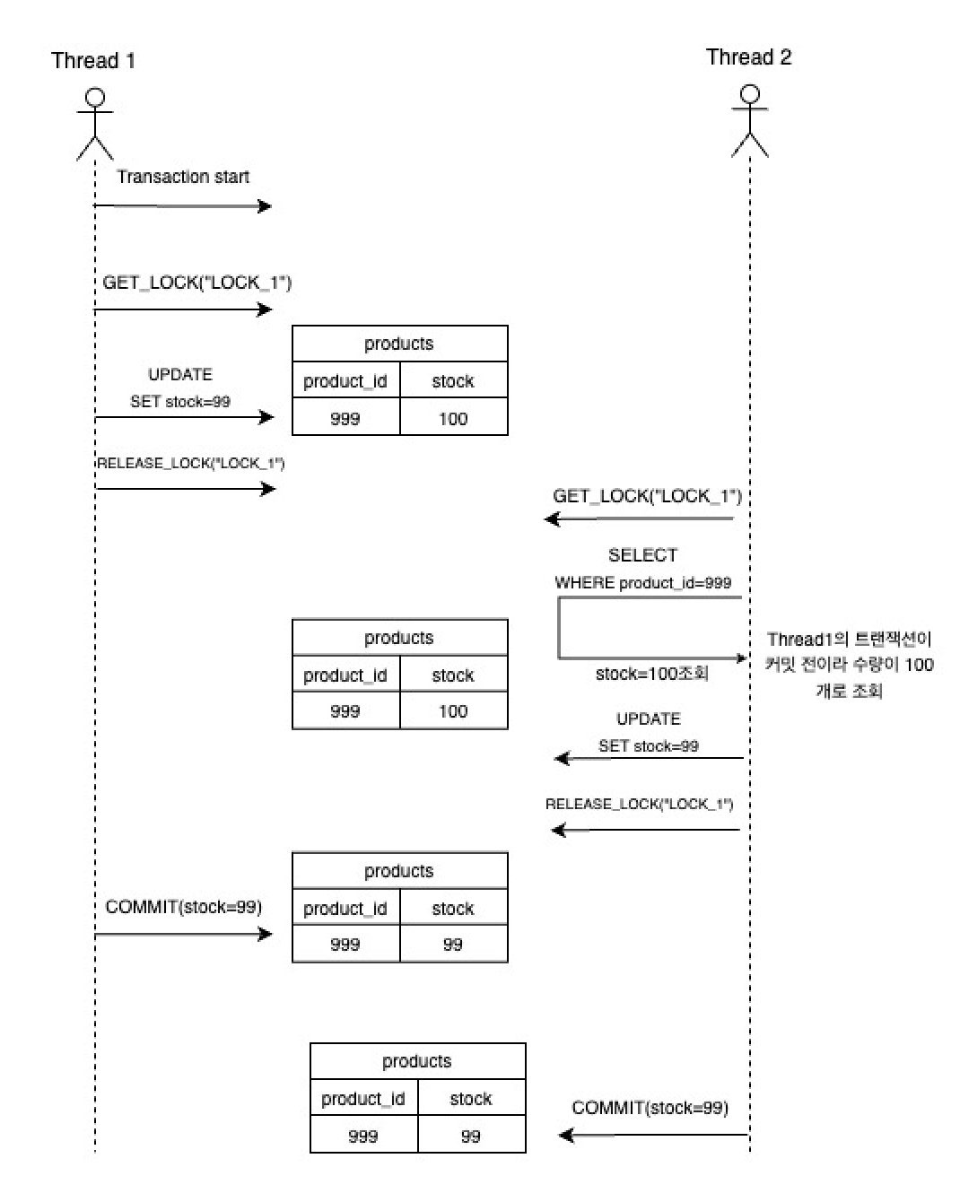 Thread 1에서 상품의 재고를 차감할 때 네임드 락을 걸고(GET_LOCK) 재고를 1개 차감한 뒤 락을 해제(RELEASE_LOCK) 하였습니다.