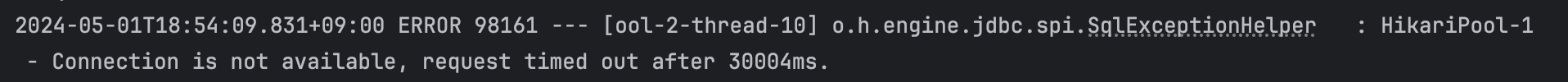 테스트 실패에 대한 에러 로그를 확인해 보면 10번 스레드에서 커넥션을 사용할 수 없다는 문제가 발생했습니다.