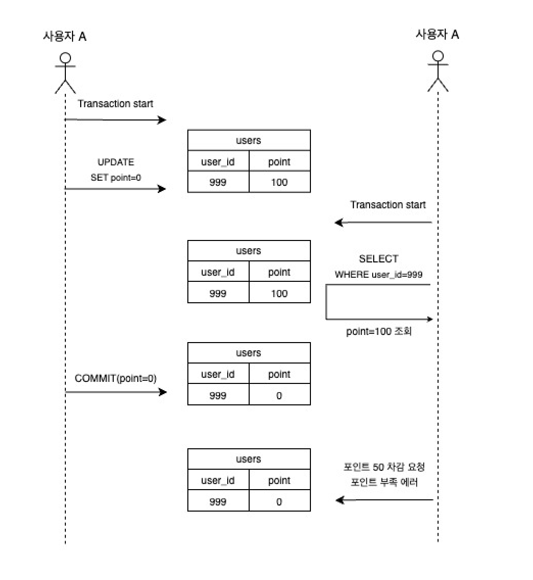 2. 동시에 다른 결제에서 50포인트를 결제 요청, 첫 번째 결제 요청의 트랜잭션이 아직 커밋되지 않았기 때문에 포인트가 100으로 확인