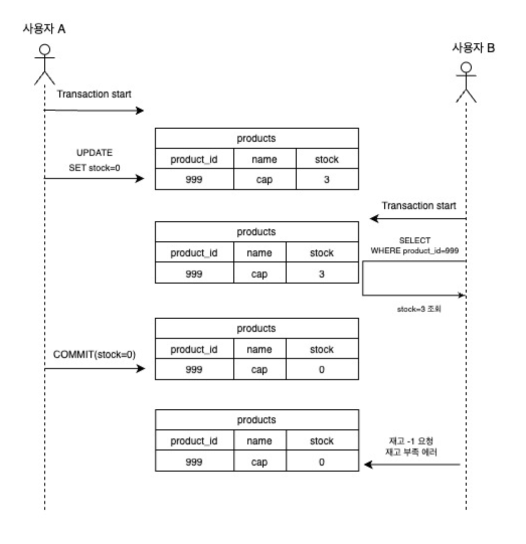 3. 사용자 A의 트랜잭션이 커밋되어 실제 재고는 0으로 업데이트