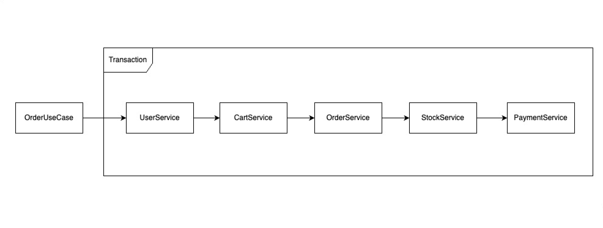 Tx -> 사용자 조회 -> 장바구니 조회 -> 주문 및 주문 아이템 생성 -> 재고 차감 -> 결제 -> 주문 정보 전송 -> commit
