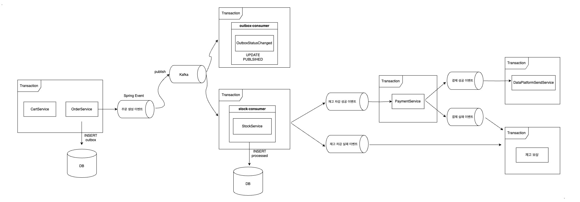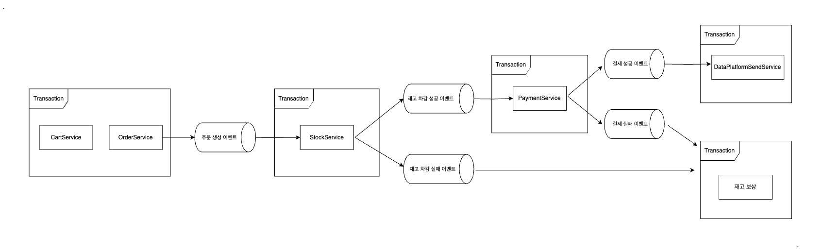 주문은 주문만 하고 이벤트 발행 -> 재고 차감은 재고 차감만 하고 이벤트 발행 -> 결제는 결제만 하고 이벤트 발행 이런 흐름으로 각각의 시스템을 한 트랜잭션 내에서 동작하도록 범위를 설정할 수 있다.