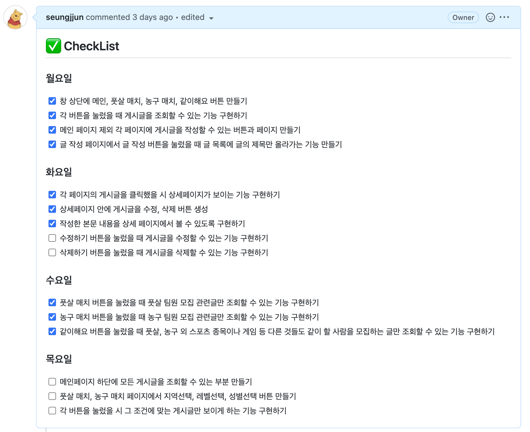 화요일에 했어야 할 일을 아직도 완수 못한 채 넘어가고 있는데 목요일에는 무조건 완성시켜서 최소한의 기능을 하는 게시판을 만들자. 그러기 위해서 해야 할 액션플랜은 아무래도 수정하기, 삭제하기 기능을 만드는 건데 혼자 하다 막히면 질문을 적극 이용하자!